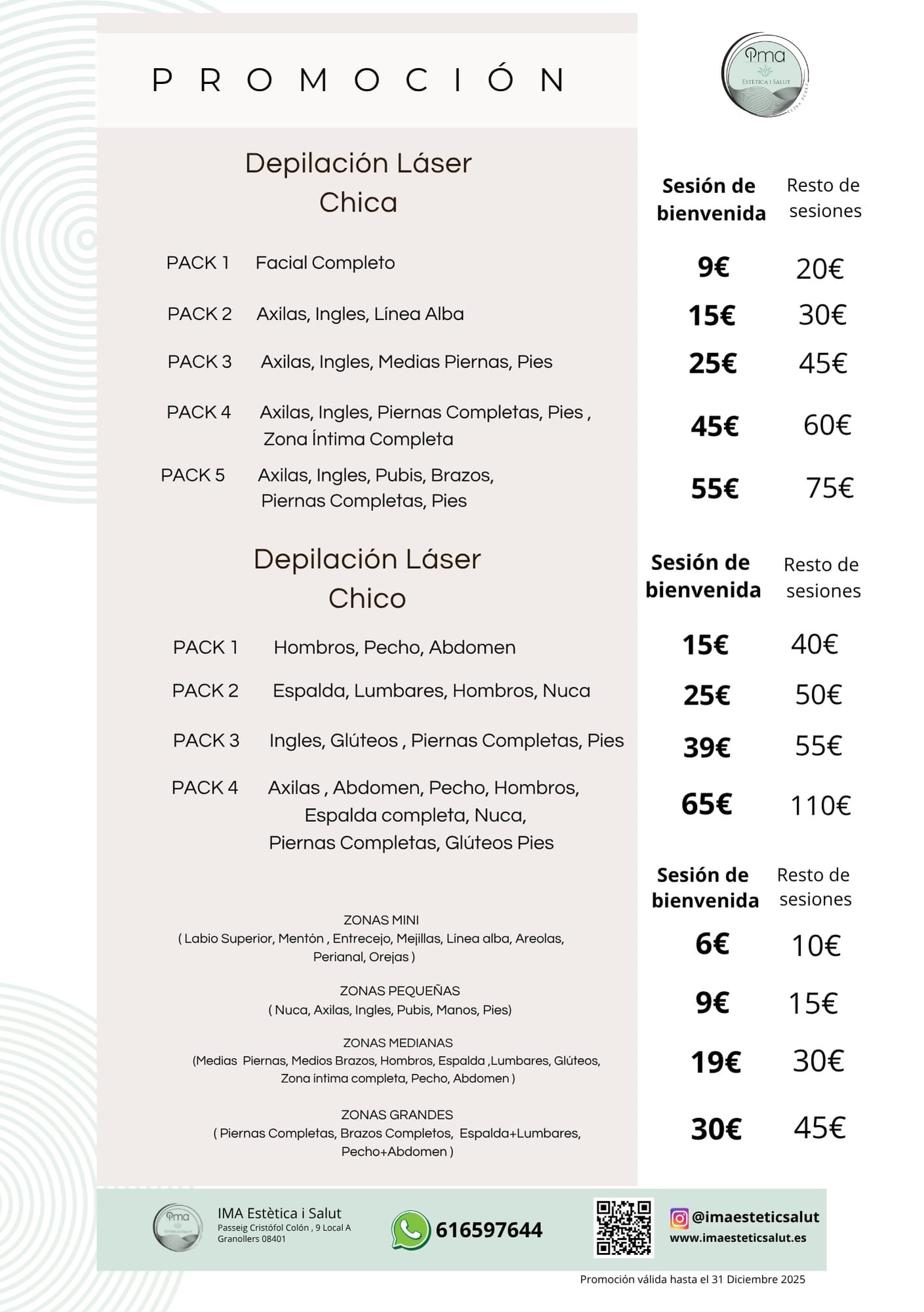 Descobreix la nostra promoció especial en depilació làser i gaudeix d’una pell suau, lliure de borrissol i cuidada des de la primera sessió. A Ima Estètica i Salut, t’oferim la tecnologia més avançada per aconseguir resultats visibles i duradors, adaptats a cada tipus de pell i de cabell. Disposem de diferents packs per a dona i home perquè puguis escollir el tractament que millor s’ajusta a les teves necessitats, amb la màxima seguretat i confort.